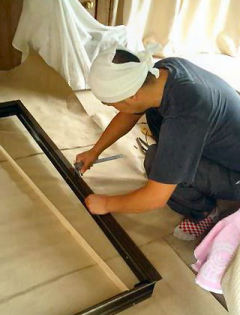 14. 仮止めしたアルミサッシ枠にガラス戸をはめてみます。
