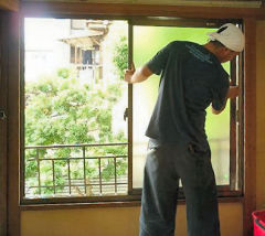 新しく取り付けたアルミサッシ枠にガラス戸を吊り込みます。