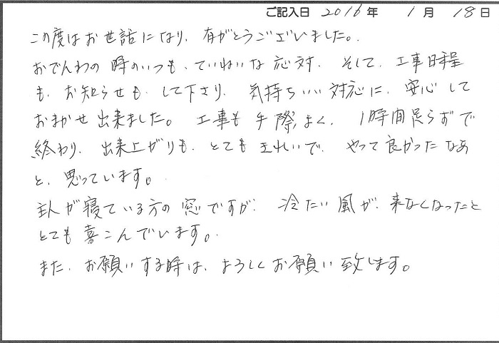 トップページ > 手書きのお客さまの声 > 結露対策・断熱対策のご感想 >