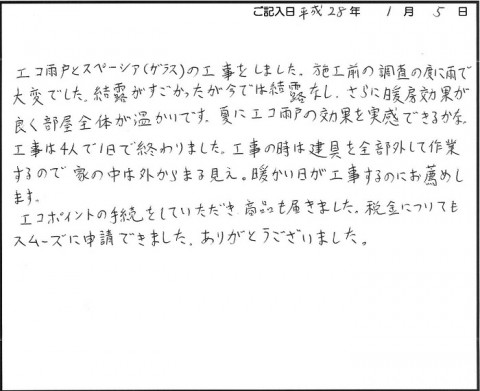 通風対策にエコアマド、断熱対策に真空ガラス「スペーシア」を施工させていただいた土方 茂さまからのお手紙です。