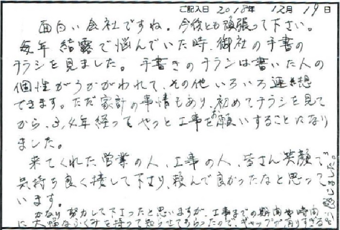 毎年、結露で悩んでいた時、御社の手書きのチラシを見ました。手書きのチラシは、書いた人の個性が うかがわれて、その他、いろいろ連想できます。ただ、家計の事情もあり、初めてチラシを見てから3、4年経って、やっと工事をお願いすることになりました。来てくれた営業の人、工事の人、皆さん笑顔で気持ち良く接して下さり、頼んで良かったなと思っています。かなり、努力してくださったと思いますが、工事までの期間や時間に大幅な含みを持って知らせてもらったので、ギャップが有りすぎるよう感じました。