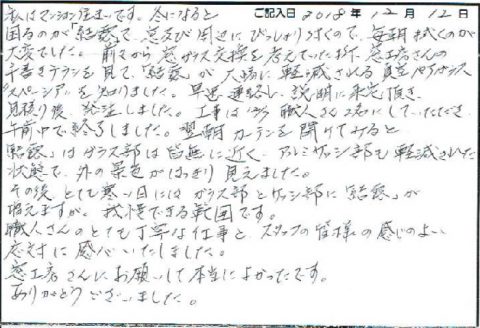 私はマンション住まいです。冬になると困るのが「結露」で窓及び周辺にびっしょり付くので、毎朝、拭くのが大変でした。前々から窓ガラス交換を考えていた折、窓工房さんの手書きチラシを見て「結露」が大幅に軽減される、真空ガラス”スペーシア″を知りました。早速、連絡し、説明に来宅頂き、見積りを発注しました。工事は12/7 職人さん2名にしていただき、午前中で終了しました。翌朝、カーテンを開けてみると「結露」は、ガラス部は皆無に近く、アルミサッシ部も軽減された状態で、外の景色がはっきり見えました。その後、とても寒い日には、ガラス部とサッシ部に「結露」が増えますが、我慢できる範囲です。職人さんのとても丁寧な仕事とスタッフの皆様の感じのよい応対に感心いたしました。窓工房さんにお願いして本当によかったです。ありがとうございました。